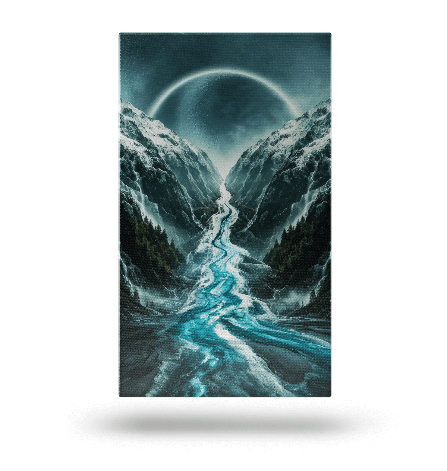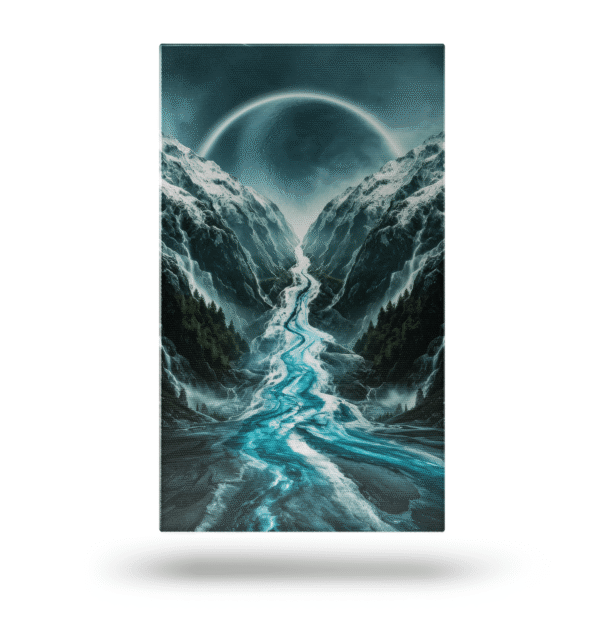 🏔️ Zdjęcie ukazuje płynącą rzekę, która odnosi się do wyobraźni, rozciągając się między wysokimi, ośnieżonymi górami. Rzeka, pozornie przecząca grawitacji, sięga w kierunku księżyca, który ma aureolę w tle.