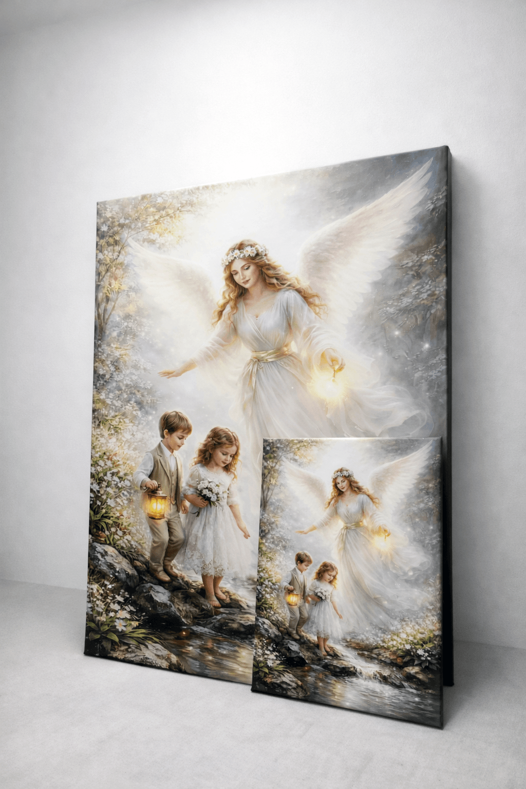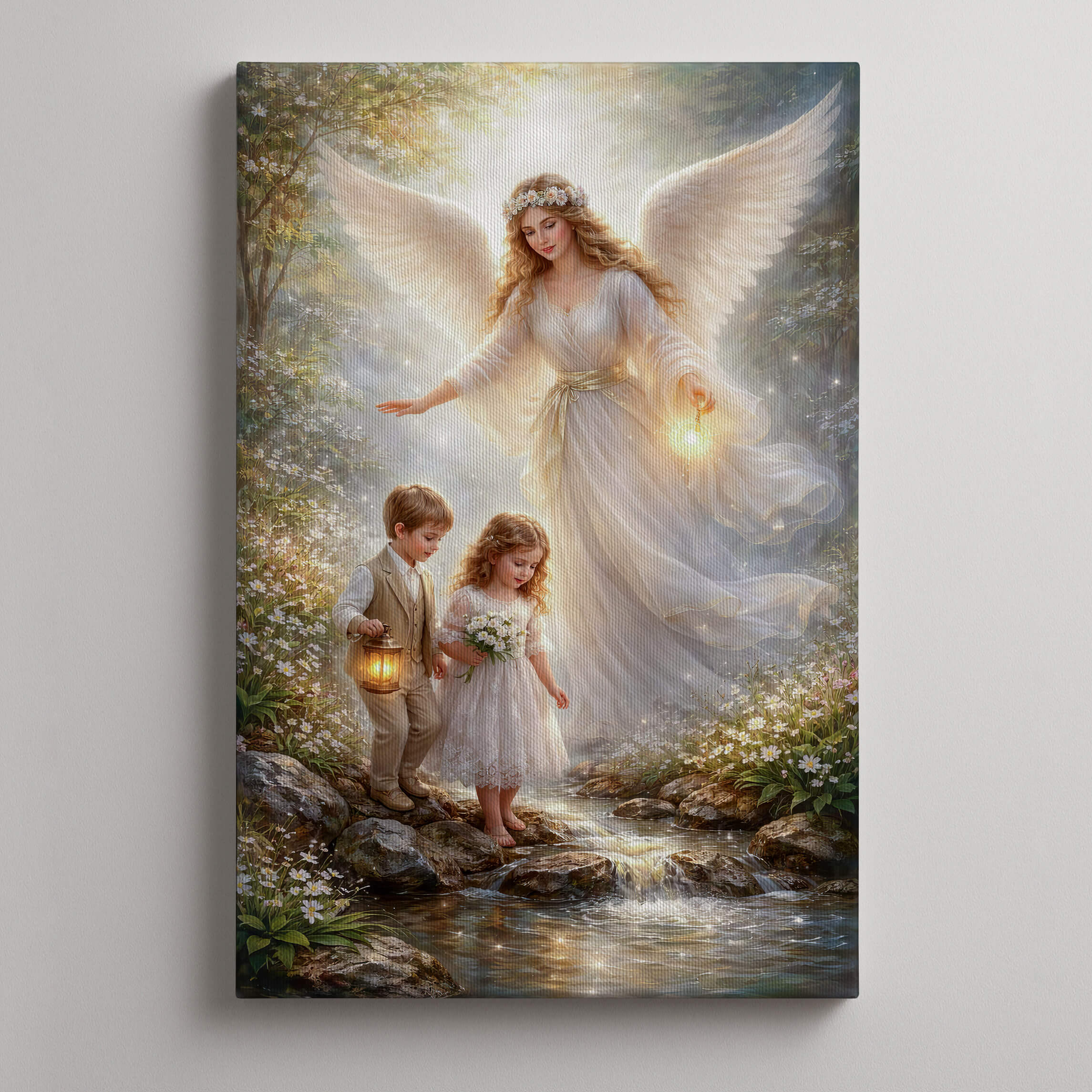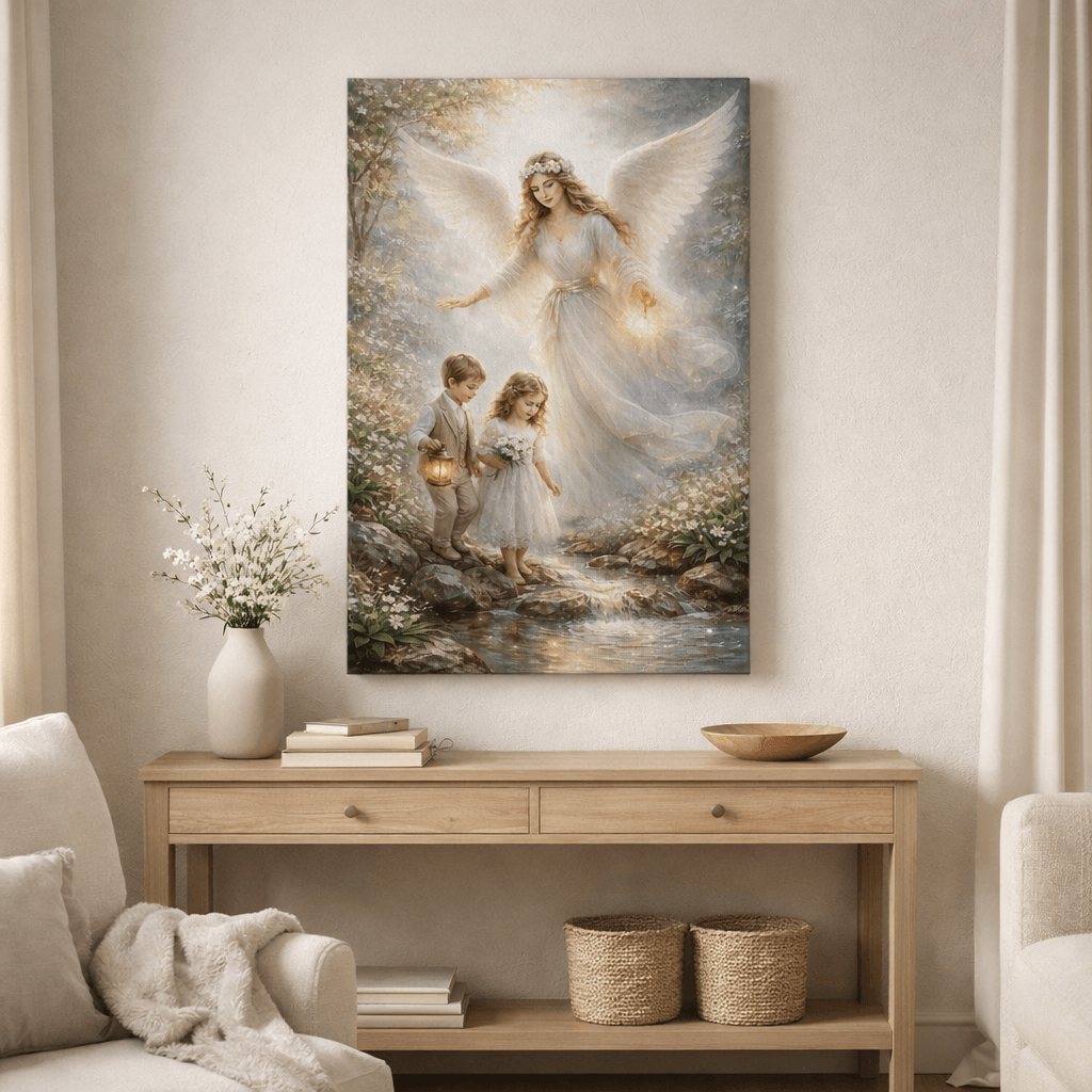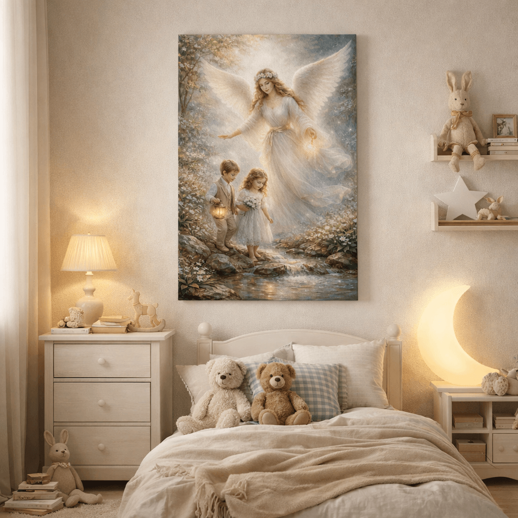 Na pierwszy rzut oka przyciąga światło – miękkie, ciepłe, jakby rozlewające się po całej scenie. Anioł Stróż otula dzieci swoją obecnością, prowadząc je bezpiecznie przez drogę. To obraz, który nie jest tylko dekoracją – on buduje atmosferę.