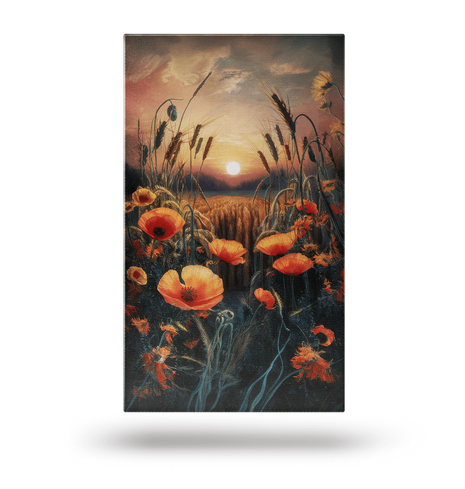 🌼 Ta kompozycja w stylu surrealistycznym i filmowym przeniesie Cię w magiczny świat, gdzie słońce zachodzi nad pełnymi maków i polnymi kwiatami w pełnym rozkwicie, tworząc obraz pełen nostalgi i uroku.